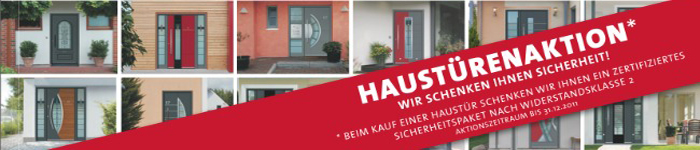 Bis zum 31.12.2013 schenken wir Ihnen beim Kauf einer Haustür ein zertifiziertes Sicherheitspaket nach der Widerstandsklasse 2. Im Gegensatz zu herkömmlichen Haustürn beinhaltet dieses Sicherheitspaket ein Türelement „aus einem Guss“. Dieses System ist von der Polizei empfohlen und bieten besten Einbruchschutz für Ihren Eingang.