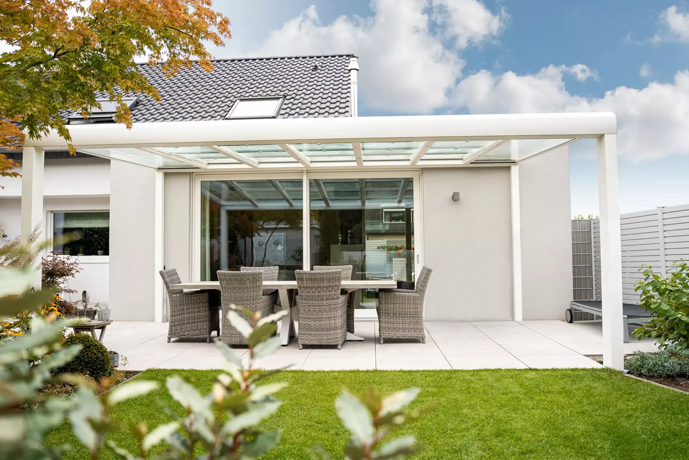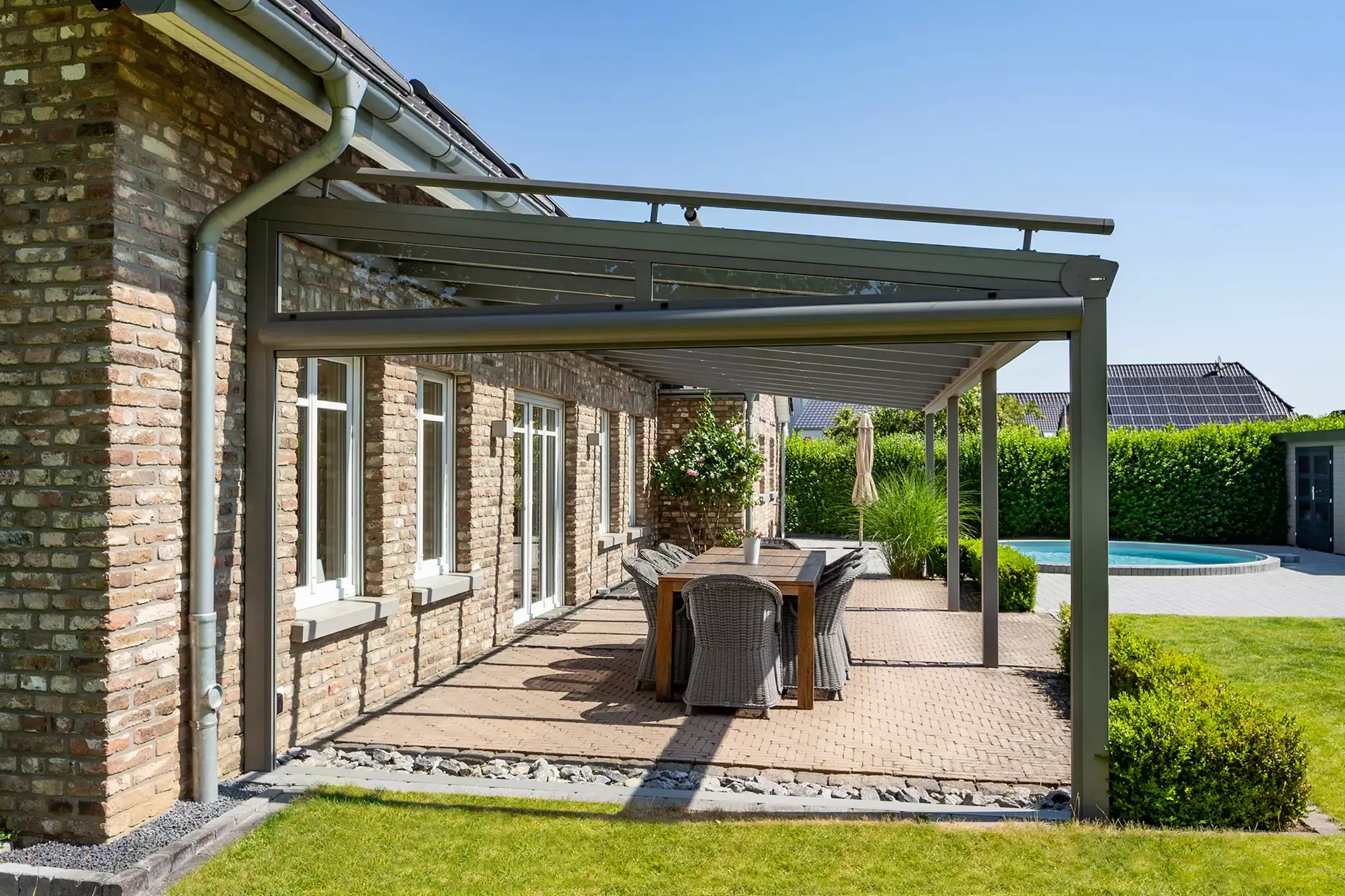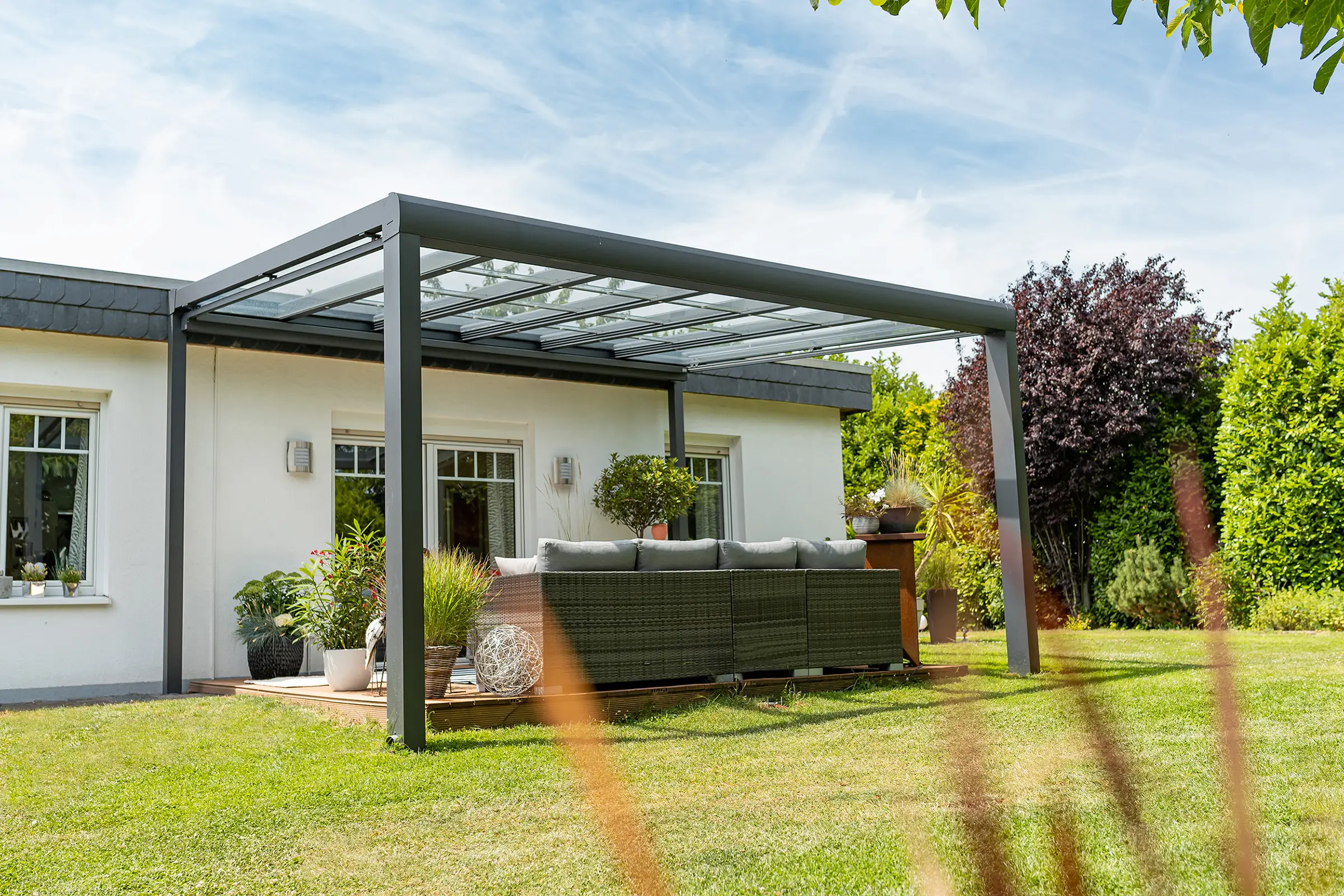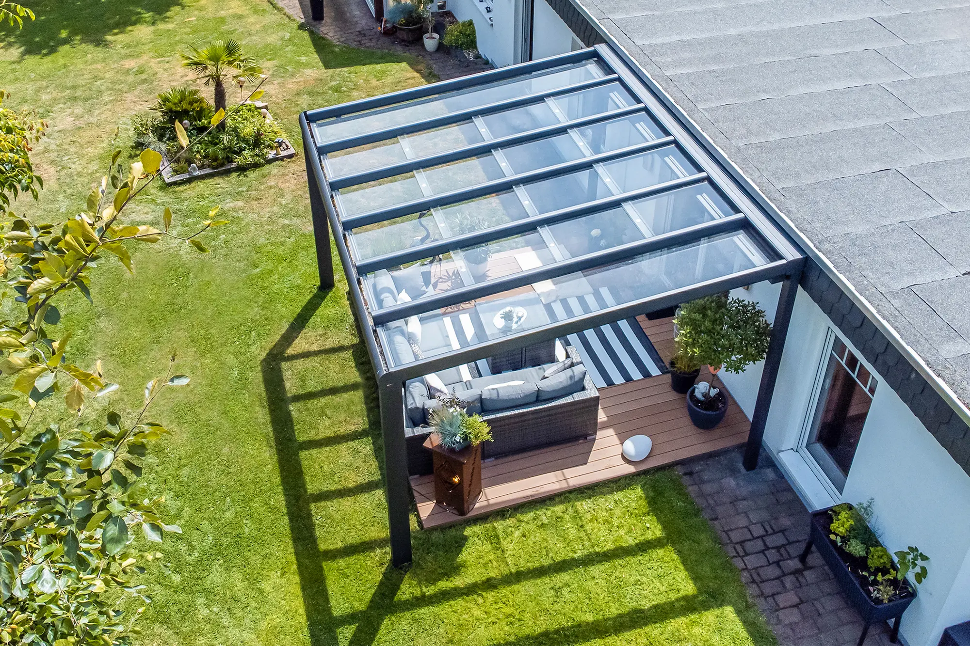 Technisch steht die Ultraline Compact den anderen Varianten in nichts nach: Sie wird individuell auf Maß gefertigt und bietet eine maximale Spannweite von bis zu 7000 x 5000 mm auf nur zwei Pfosten. Die Dacheindeckung besteht aus 8 mm oder 10 mm Verbundsicherheitsglas, wahlweise auch mit Milchglas- oder Hitzeschutzoption. Wer ein stilvolles, zurückhaltendes Design mit hoher Funktionalität verbinden möchte, findet in der Ultraline Compact eine überzeugende Lösung.