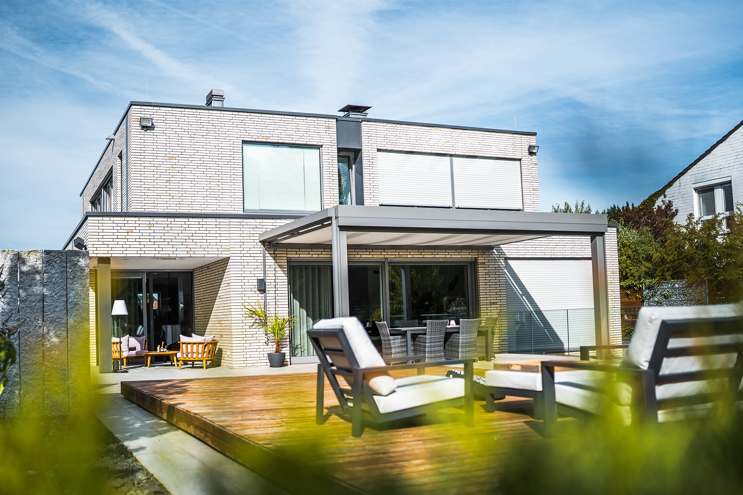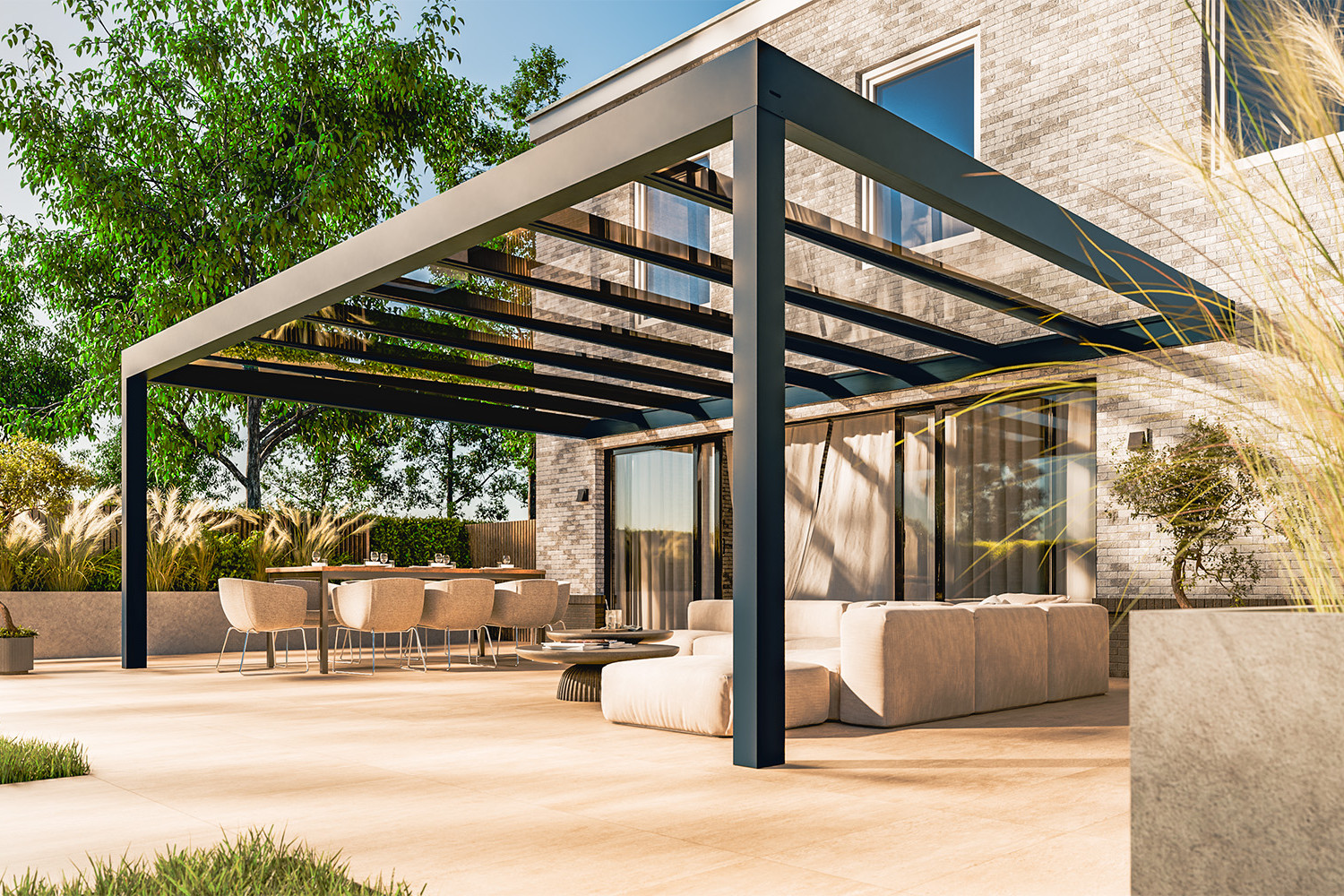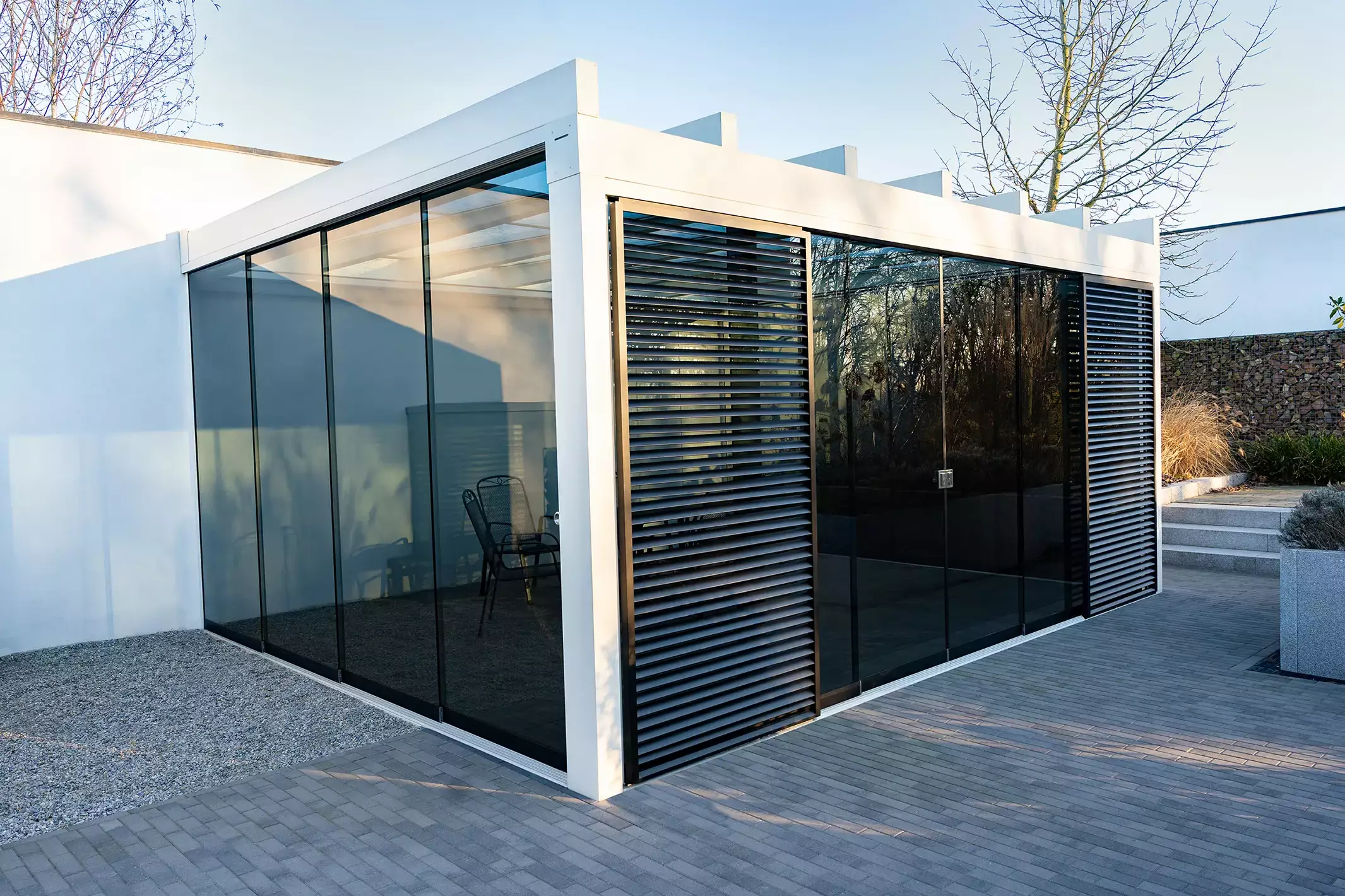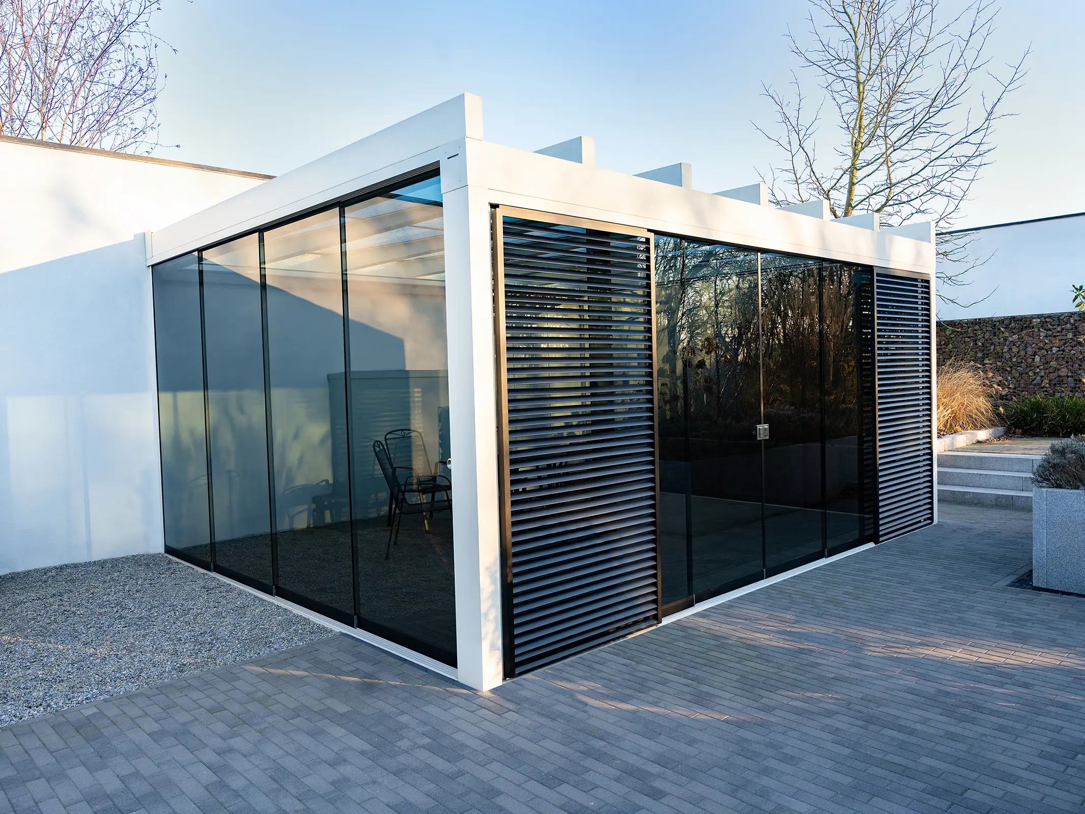 Die Skyline ist das neueste Modell im ALUXE-Portfolio und überzeugt durch ihr modernes, reduziertes Design in schlanker Flachdach-Optik. Mit klaren Linien und einer kubistischen Formensprache fügt sie sich harmonisch in zeitgenössische Architektur ein. Ihre horizontale Bauweise macht sie zur idealen Lösung für den Ausbau eines geschützten Gartenzimmers – elegant am Haus oder als freistehendes Highlight im Garten.