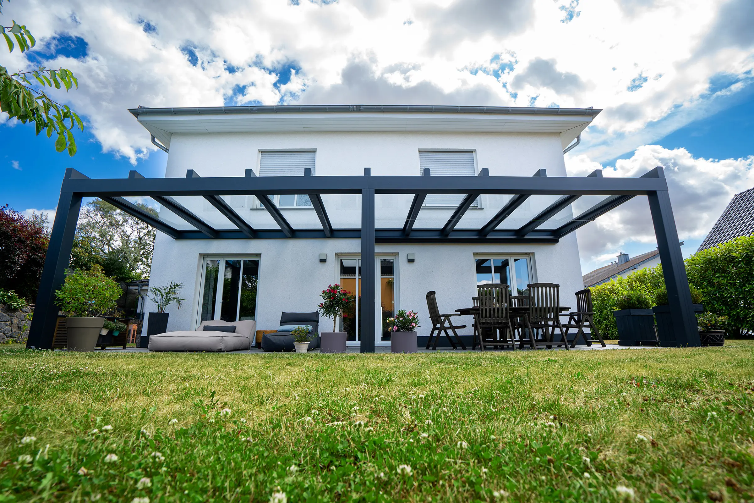 Die Ultraline Classic vereint moderne Architektur mit hoher Funktionalität und überzeugt durch ihre markante Flachdach-Optik mit charakteristischem Dachüberstand. Diese hochwertige Überdachung wird individuell auf Maß gefertigt und passt sich stilvoll an jede Hausarchitektur an. Trotz ihrer robusten Konstruktion wirkt sie leicht und elegant – ideal für anspruchsvolle Außenbereiche.